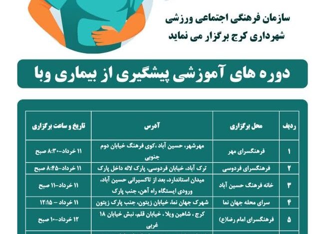رئیس سازمان فرهنگی، اجتماعی و ورزشی شهرداری کرج بیان کرد: دورههای رایگان آموزشی با موضوع پیشگیری از بیماری “وبا” در مراکز تحت نظارت این سازمان، نظیر فرهنگسراها و سراهای محله مستقر در مناطق مختلف شهر کرج برگزار میشود.